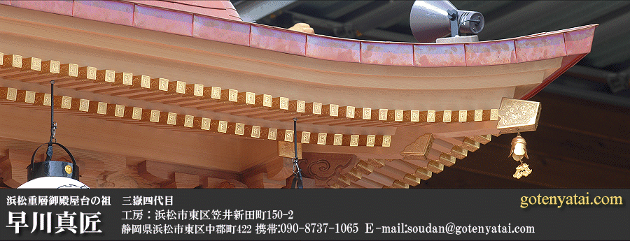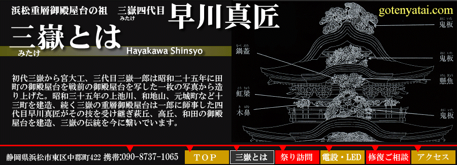 初代から宮大工、三代目三嶽一郎からは浜松の御殿屋台の家計伝統となった三嶽一門は戦後浜松市田町・常盤町の御殿屋台建造からはじまり、以来13町の御殿屋台を建造しています。