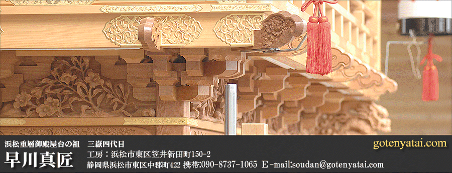 浜松の御殿屋台といえば三嶽の重層御殿屋台、大きな屋台蔵から曳き出した屋台の前に集まっていただきました。